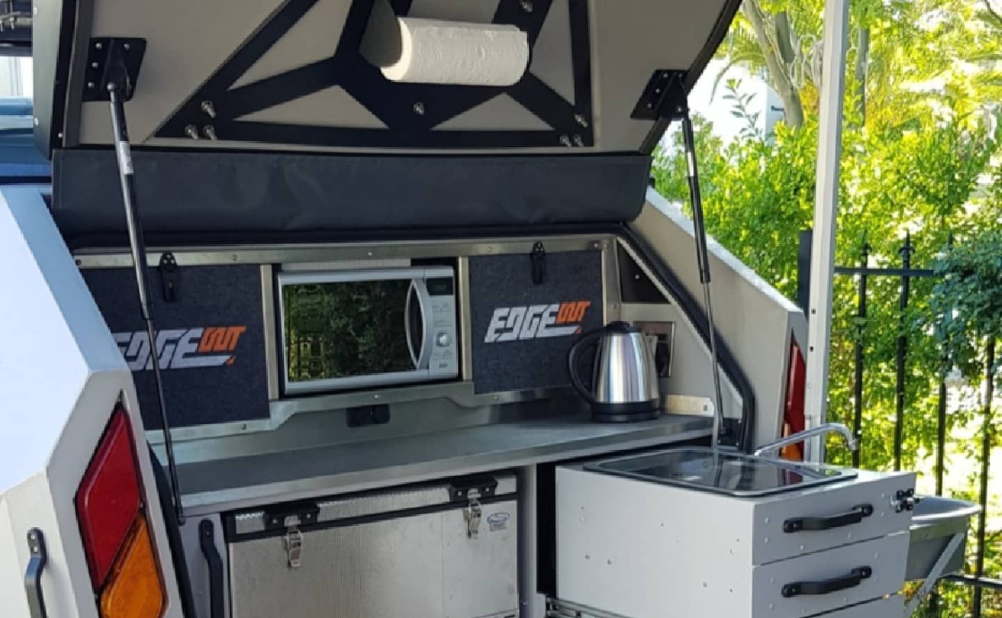 De EdgeOut Trailer buitenkeuken is perfect om buiten te koken! Met een uittrekbare keukenbar, een kraan met spoelbak, verlichting, USB-poorten, 230V-poorten. De Dometic tweepits gaskookplaat met glazen afdekplaat biedt hij alles wat je nodig hebt om buiten te koken en te genieten. De opbergruimte onder de keukenbar is perfect voor het opbergen van een koelbox! Praktisch en goed doordacht!
