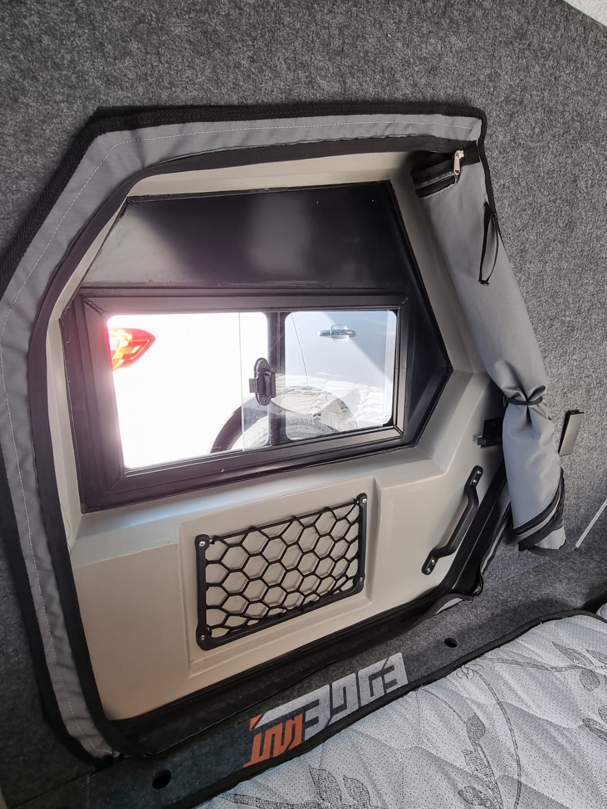 De EdgeOut-trailer valt op door een interieur dat zowel comfortabel als functioneel is. Een klamboe bij de ingang houdt vervelende insecten buiten, terwijl opbergnetten en schuiframen in de deuren voor een aangename ventilatie zorgen.